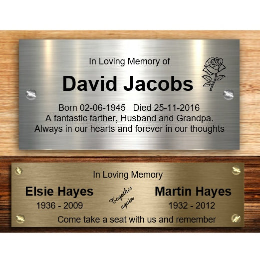 Check out our memorial bench plaques! Made from lacquered jewellers brass, they're built to last and won't tarnish over time. Plus, we offer free logos and artwork, free engraving, and free fixings.